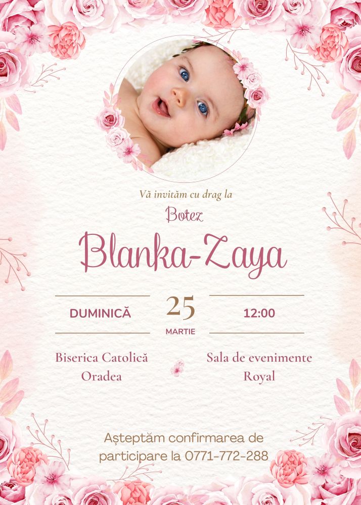 Invitație personalizată de botez, floricele roz