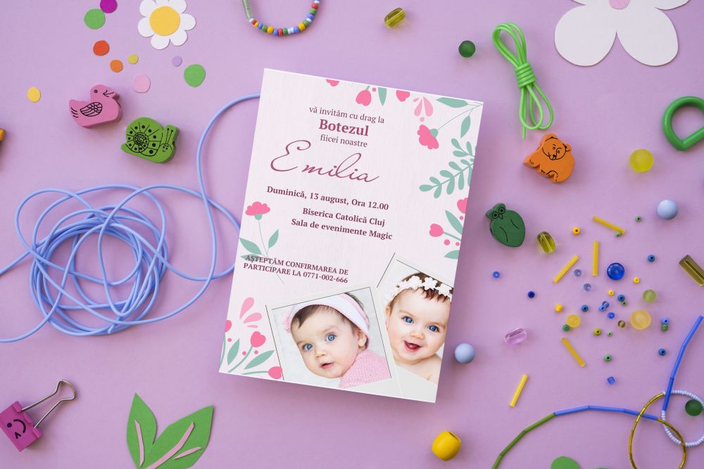 • Invitații personalizate cu numele bebelușului și detaliile evenimentului