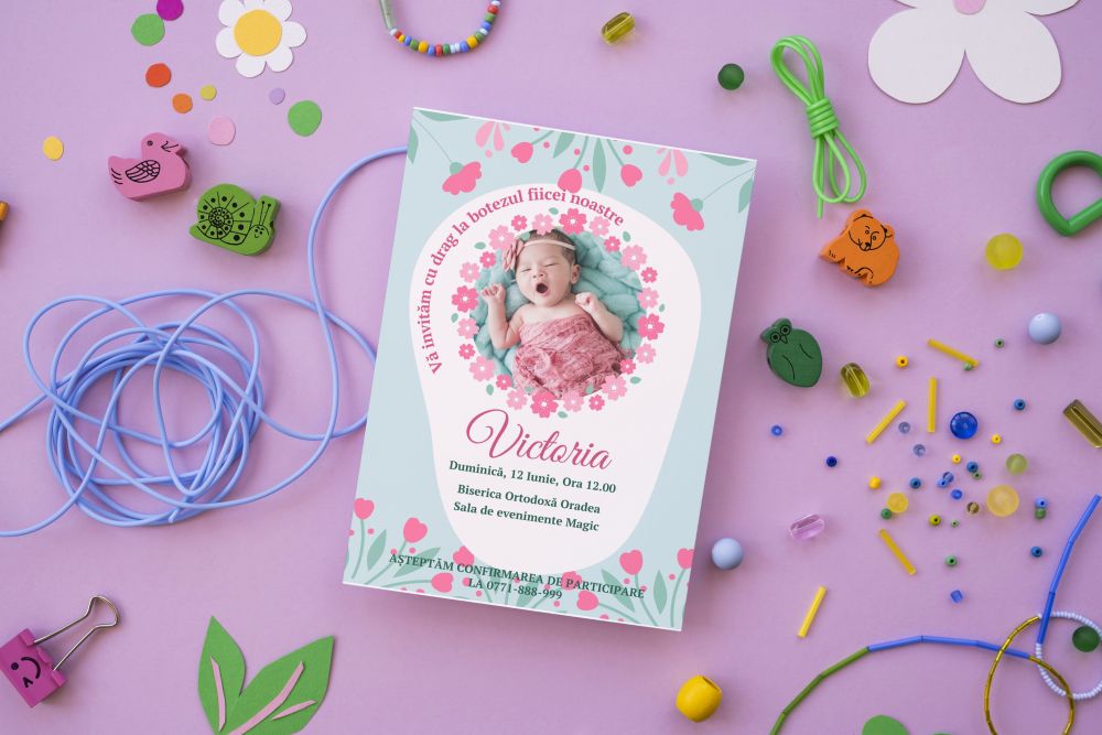 • Invitații personalizate cu numele bebelușului și detaliile evenimentului
