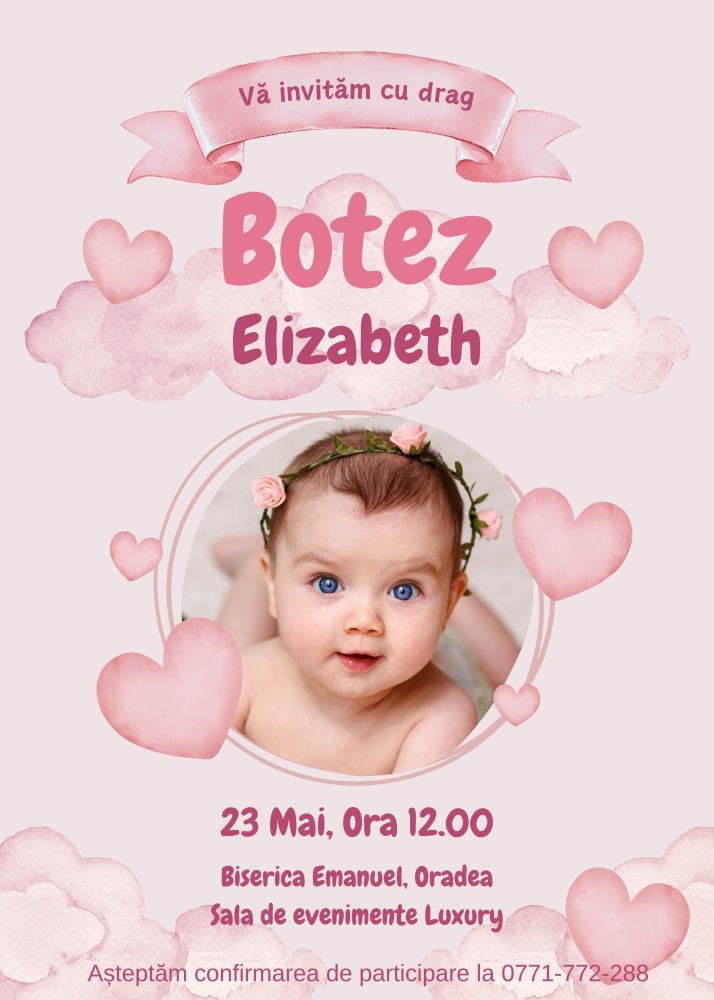 Invitație personalizată de botez, norișori, inimioare
