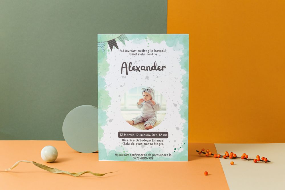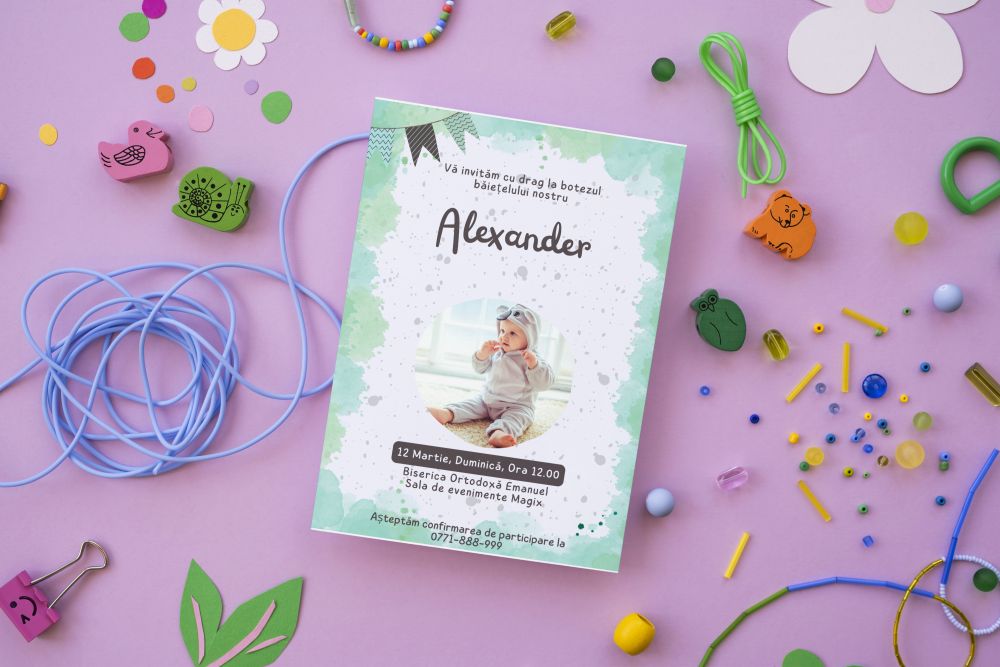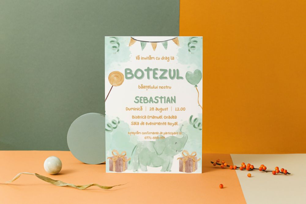 • Invitații personalizate cu numele bebelușului și detaliile evenimentului